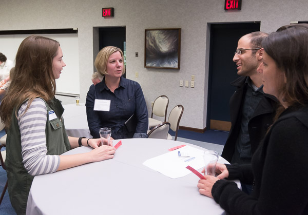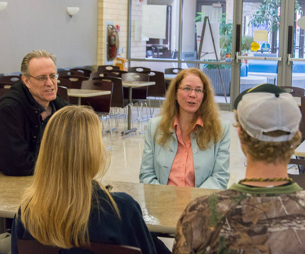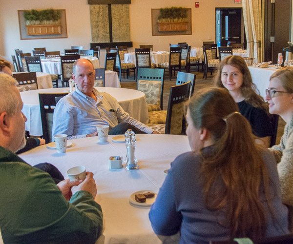 Carolyn R. Strickland (second from left), vice president for enrollment management/associate provost, talks with returning student leaders. Clockwise from left are alums Erin A. Karpich, Mark R. Capellazzi (now a Penn College admissions representative) and Sabrena A. O’Keefe.