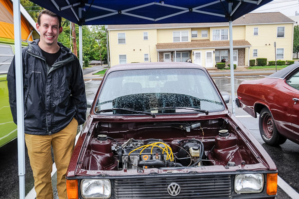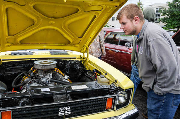 Mitchell J. Berninger, a web and interactive major and member of the Phi Mu Delta brotherhood, checks out an entry at the fraternity-sponsored car show.