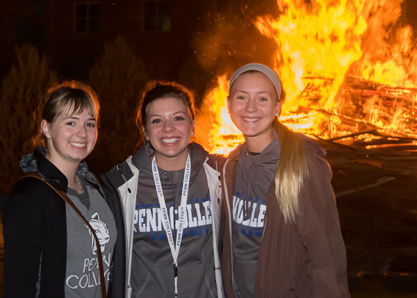 Framed by flames are (from left) Samantha K. Steiger, Emily R. Sillaman and Libby M. Gingrich, all majoring in pre-dental hygiene.