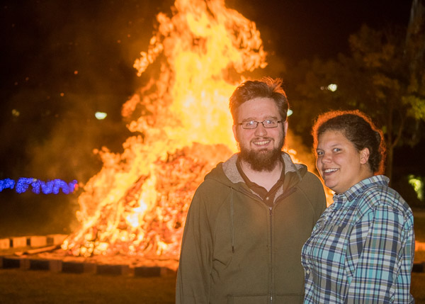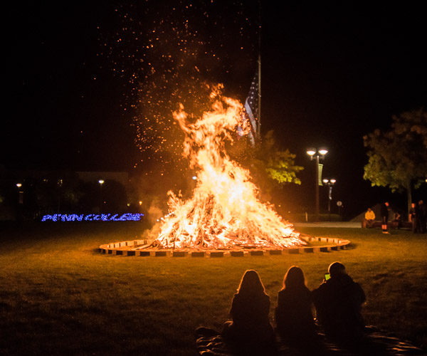 Taking some of the edge off a damp Thursday evening is the Homecoming bonfire, this year moved to the library lawn.