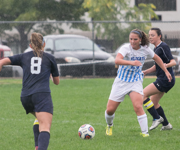 Midfielder Jane M. Herman, whose penalty kick provided the second goal in the Wildcats' Saturday victory against Cazenovia, moves the ball downfield.