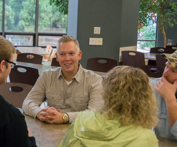 A group visits with Kevin R. Derr, professor of legal assistant, over snacks.