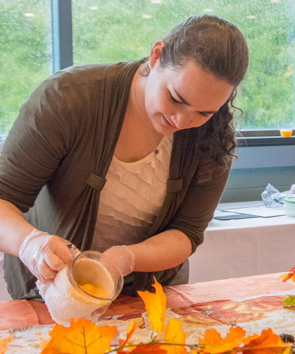 Pokémon fan (as indicated by her table décor) and hospitality management student Caitlin M. McDermott, of Kutztown, adds a dollop of ice cream to her “Caitlin’s Kawaii Cranberry Cider,” a concoction of cranberry juice, chai tea and ice cream.