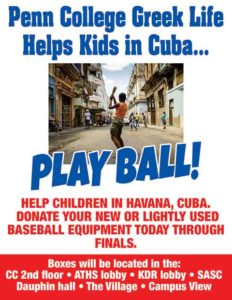 Members of Pennsylvania College of Technology’s Greek Life have teamed up with a math professor to solicit donations of used baseball equipment to be sent to young baseball players in Cuba.