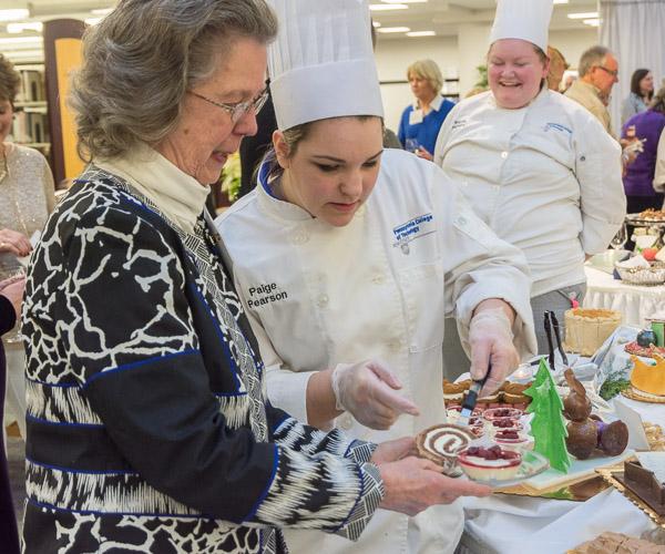 Students in the baking and pastry arts major coordinated a grand buffet Saturday that served as a capstone to their associate degree and as a gesture of gratitude to those whose gifts support the applied-technology education provided by Penn College. For the students, the buffet is the final project in the Pastry Food Show and Buffet Presentations Concepts course. Taught by Todd M. Keeley, instructor of baking and pastry arts and culinary arts, the course incorporates skills learned throughout the students’ associate-degree education. In addition to carefully planning the presentation, each student produced edible centerpieces and a variety of decadent pastries. The event also celebrated the 10th anniversary of the Madigan Library, which opened to students in 2006. Invited guests included donors to the library and members of the college’s 1914 Society. “Whether a donation is turned into a book or a study carrel or an online resource, it becomes part of the brick and mortar of this building, a resource used innumerable times by a continuous array of students and faculty,” said Tracey Amey, library director, who joined President Davie Jane Gilmour in offering remarks to the guests. “I have the privilege of seeing your donations in action every day, and I offer a deep and heartfelt 'Thank you.'”