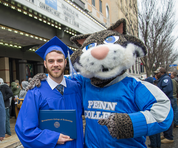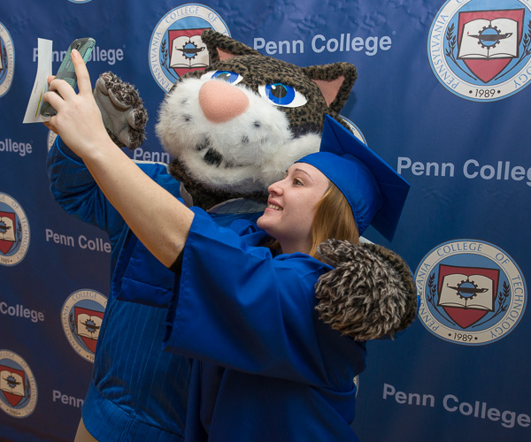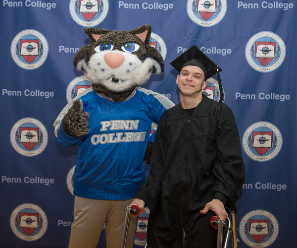 Striking a pose post-ceremony is Garrett L. Woodring, Tyrone, heating, ventilation and air conditioning technology, and our favorite mascot.