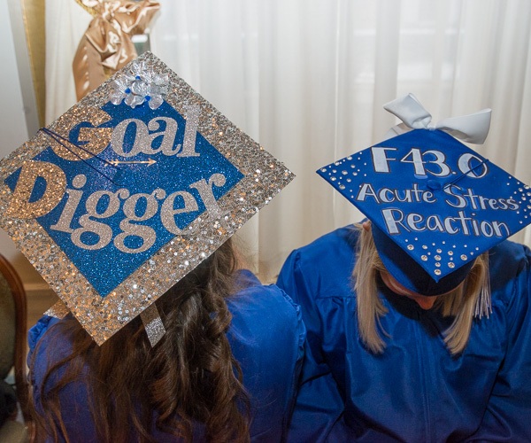 Sparkling grad caps recognize goals and a diagnosis code familiar to health information technology majors.
