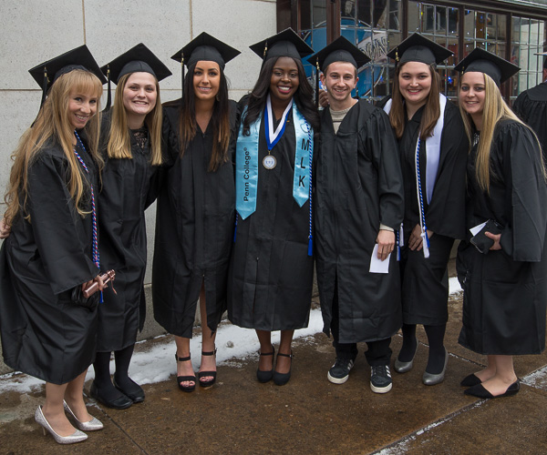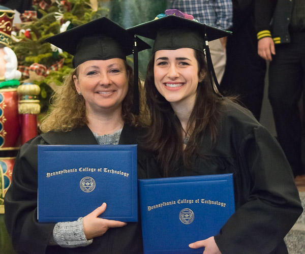 A Williamsport mother-daughter duo (who helped each other with their studies) start their joint celebration outside the CAC: Lori E. Pepperman (left), technology management, and Marissa E. Ray, business administration: management concentration. (Mom is a financial aid assistant at the college; her daughter worked in Dining Services while a student.)