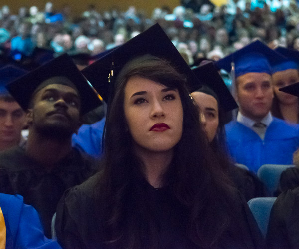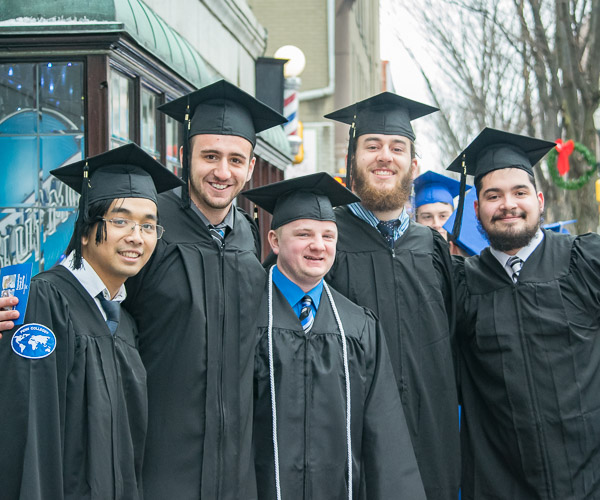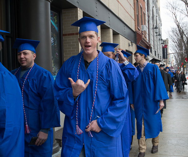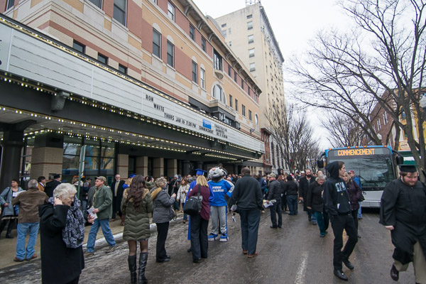 A group huddle keeps these graduates warm on their walk from The Genetti to the Arts Center.