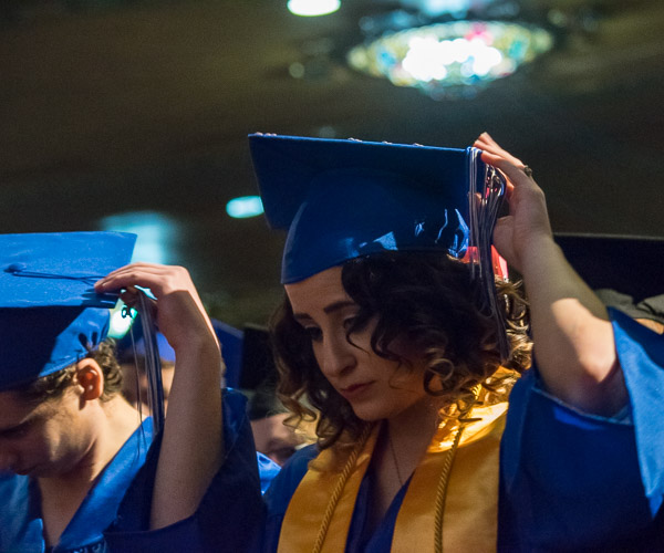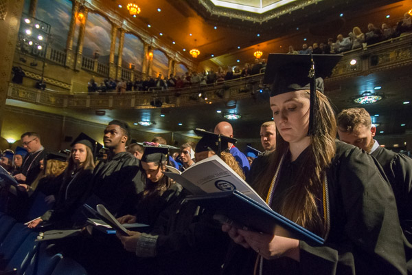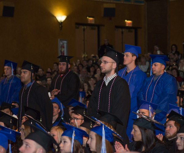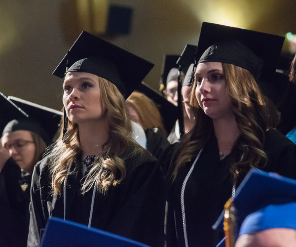 Bachelor-degree nursing students, anticipating Saturday’s commencement ceremony, enter their pinning ceremony in the Klump Academic Center Auditorium bearing candles.