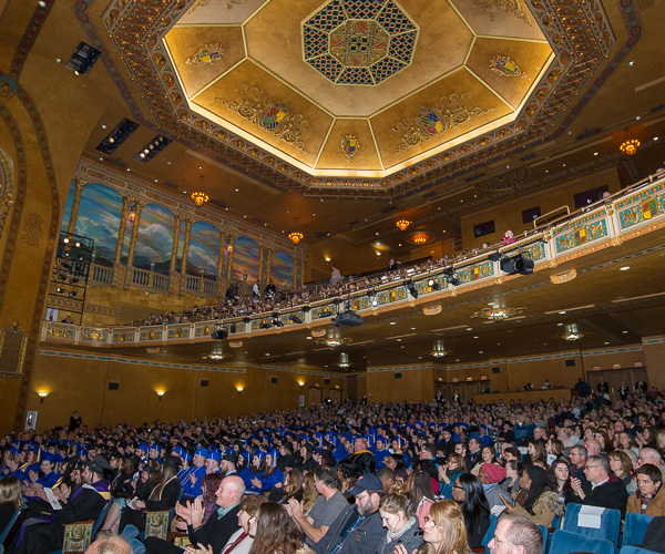 An overhead screen amplifies the grandeur of each graduate's symbolic journey across the stage.