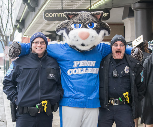 Penn College Police Officers Justin M. Hakes (left) and Charles E. O'Brien share laughs with a furry buddy.