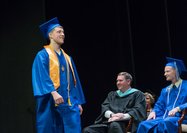 Cartmell regales the audience with tales of his first semester – when he managed to succeed in his classes (and at dining) despite two broken arms. He urged each of his fellow graduates to “be a contributing member of society.”