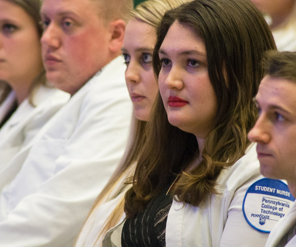 Nursing student Steven D. Robinette, of Selinsgrove, offers a touching address at a Friday morning pinning ceremony for graduating bachelor-degree nursing students.
