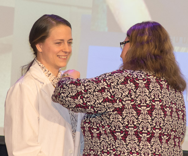 Joni J. Pyle, assistant professor of nursing, pins Alicia A. Brant, of Mifflinburg. The pin was passed on to Brant by her grandmother.