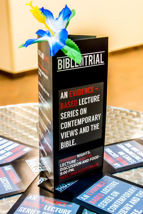 "Bible on Trial," a two-month series of conversations, sponsored by the Penn College Music Club and held at 8 p.m. Tuesdays in the Student & Administrative Services Center's first-floor presentation room, began this week. The opening topic in the program, which provides students with a venue for informal discussion of spirituality, was "The Bible and Validity Testing." Scheduled for future consideration are: Sept. 12, "Creation vs. Evolution"; Sept. 19, "Everything Metaphysical (Angels and Demons)"; Sept. 26, "Free Will vs. Determinism"; Oct. 3, "Love & Relationship vs. Rules & Religion"; Oct. 10, "Jesus – Myth, Man, Martyr or More?"; Oct. 17, "The Bible and Sex"; and Oct. 24, "The Bible and Mind-Altering Substances."Photos by Rachel A. Eirmann, student photographer