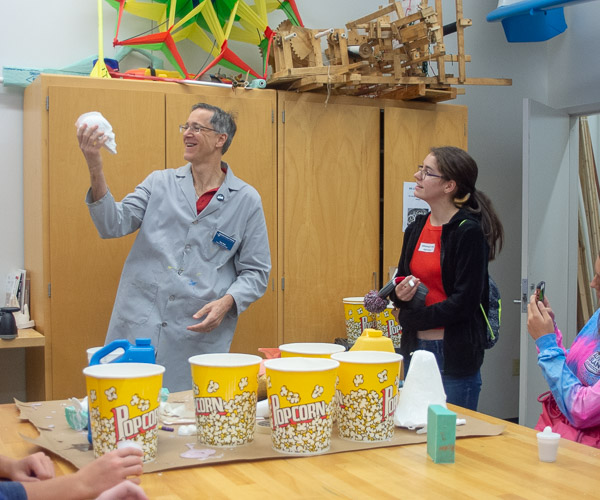 Led by Tom Gregory, associate vice president for instruction, a group from Cowanesque Valley checks out an assortment of projects being pursued by students in The Dr. Welch Workshop: A Makerspace at Penn College. Projects included a cardboard airplane (shown), costume (cosplay) pieces and a fighting robot.