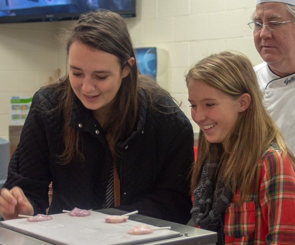 During a session on Modern Kitchens, led by Chefs Frank M. Suchwala (right) and Todd M. Keeley, students from Central Columbia High School make yogurt pops on an “anti-griddle,” a flash freeze appliance that cools to minus 30 degrees.
