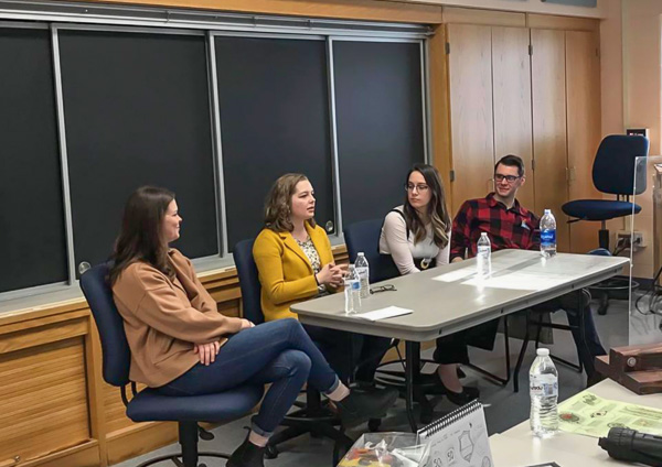 Four graphic design alumni who are creatively fulfilling artistic aspirations returned to campus last weekend to share their experiences with students. Brody W. Gray, ’15, art director at D.G. Yuengling & Son Inc. in Pottsville; Morgan N. Keyser, ’17, associate designer at Andculture in Harrisburg; Laurea (Lapp) McLeland, ’13, senior designer at Seedhouse Design in Chicago; and Emmalee J. Williams, ’16, marketing manager at the Community Arts Center in Williamsport gave a straightforward look at the transition from student to professional in individual presentations and a culminating panel discussion. The informal conversations offered collegiate and career advice to graphic design and advertising art students, as well as the opportunity to pose questions to the panelists. “As a senior in the graphic design program, it was really interesting to hear about how our major’s alumni developed as designers after college,” Nina L. Walk said. “Each speaker took a different avenue to arrive where they are now. It was inspiring to hear about all of the successes, losses and changes that helped shape their careers.” This is the fourth time the graphic design alumni panel has been organized by Penn College’s student chapter of AIGA, a professional association for design, and Nicholas L. Stephenson, instructor of graphic design and chapter adviser.