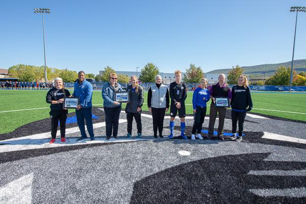 Making their way onto the field for the dedication ceremony are Ramel Newerls (front left), PepsiCo key account manager; women’s soccer forward Morgan Brooks (front right); and Amy Brooks (behind Newerls), vice president of sales, Susquehanna Trailways.