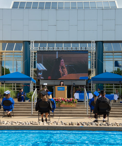 Class representative Alexandra “Ali” D. Petrizzi, who recently landed a “dream job” with Vera Bradley, addresses her fellow 2020 graduates. In her remarks, a prerecorded version of which was broadcast at subsequent ceremonies, Petrizzi thanked family, friends, her network of college mentors – and Starbucks – for helping her along her road to success.