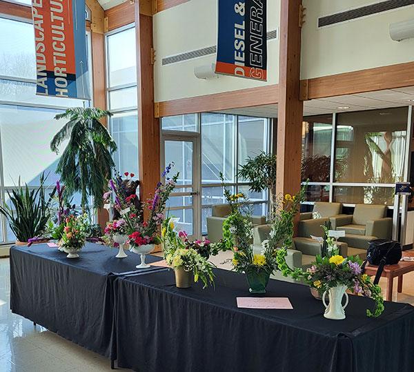 The always-appealing work of students in Karen R. Ruhl's Art of Floral Design course, seasonally accented by the Valentine bear "stuffed" into the corner of the lobby, went on temporary display inside the Schneebeli Earth Science Center's main entrance on Wednesday. The class was challenged to produce examples of Line Design, stylishly drawing the viewer's gaze throughout their varied creations. The tabletop arrangements (from left) represent the lab output of Ralph H. Johnson, Ashland; Carrie M. Reich, Mifflinburg; Sonia C. Good, Linden; Tristan J. Current, Reinholds; Kylie N. Butler, Wellsboro; Elizabeth R. Bryan, Pleasant Gap; Madison E. Dipre-Giles, Muncy; Grace E. Maneval, Montgomery; and Paul J. Bromm, Forest Grove. The popular class (HRT260) is open to all majors, as evidenced by this semester's group: Bromm is enrolled in applied management; Bryan, Dipre-Giles, Maneval and Reich in landscape/plant production technology; and Butler, Current and Johnson in forest technology.