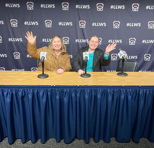 O'Neill (with Ford) literally tries her hand at the Global Connections Touch Table, among the many attractions at the World of Little League Museum in South Williamsport.