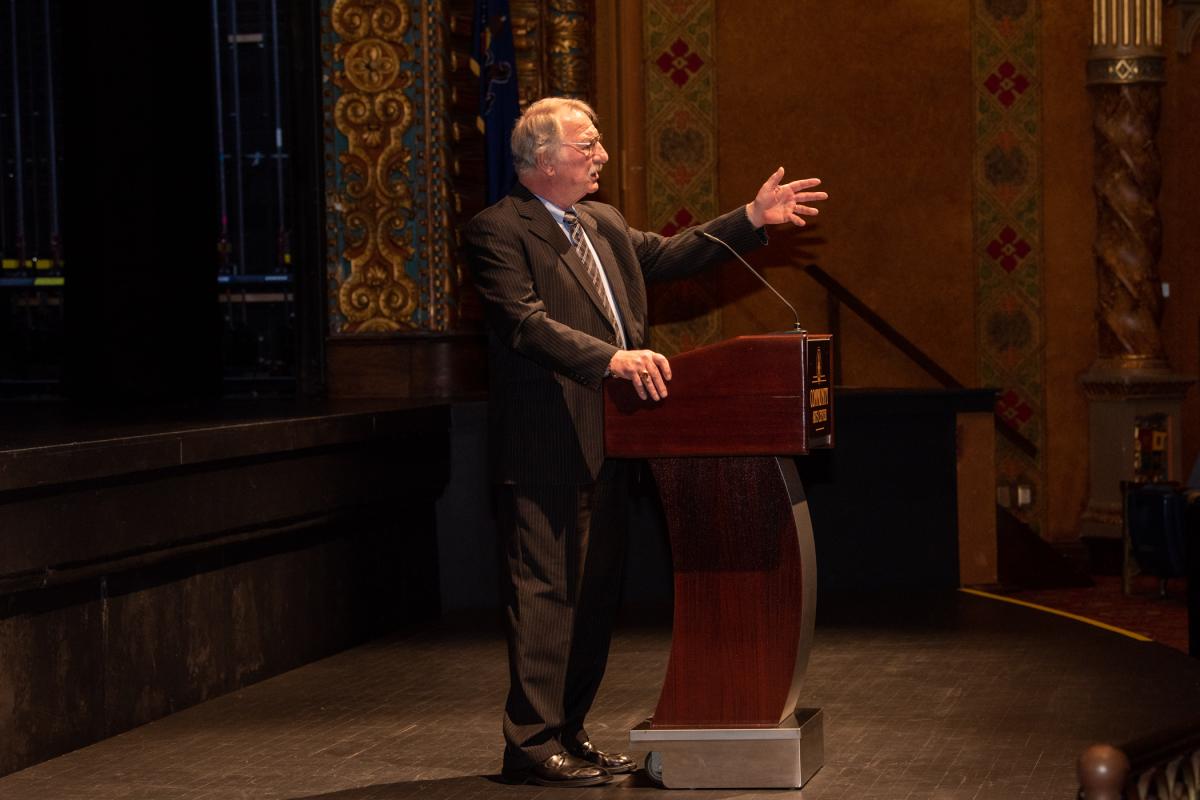 Dougherty acknowledges the event sponsors as the audience applauds.