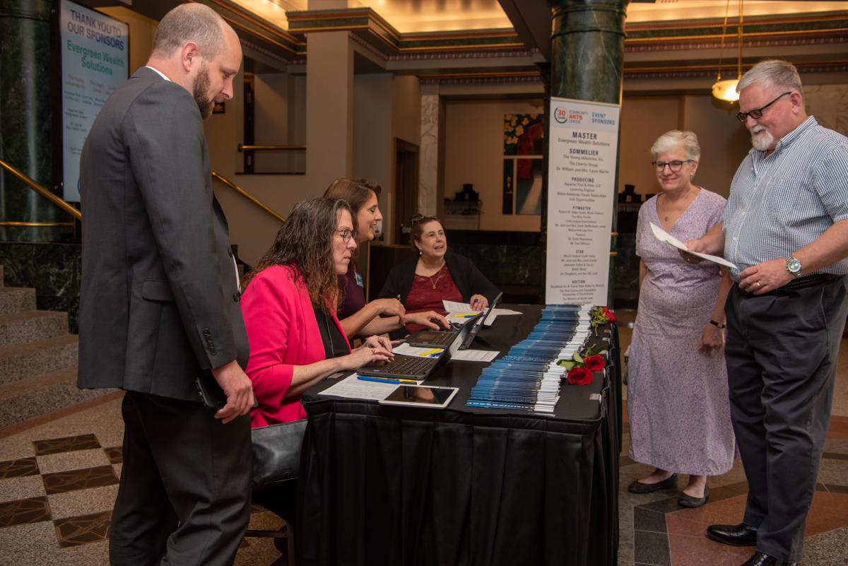 In the outer lobby, College Relations and CAC staff help guests, such as Sondra and Kirk Fisher, check in.