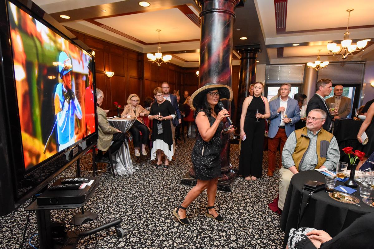 Sporting a “Derby hat,” Gonzalez-White addresses the Capitol Lounge crowd prior to the “Run for the Roses.”