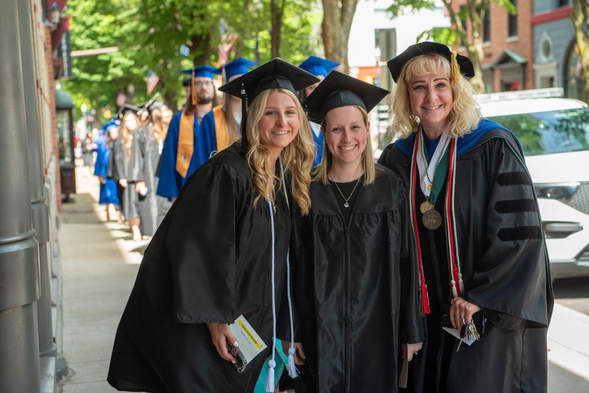 Tina M. Evans (right), associate professor of applied health studies, pauses to pose with her mentees in the processional line.
