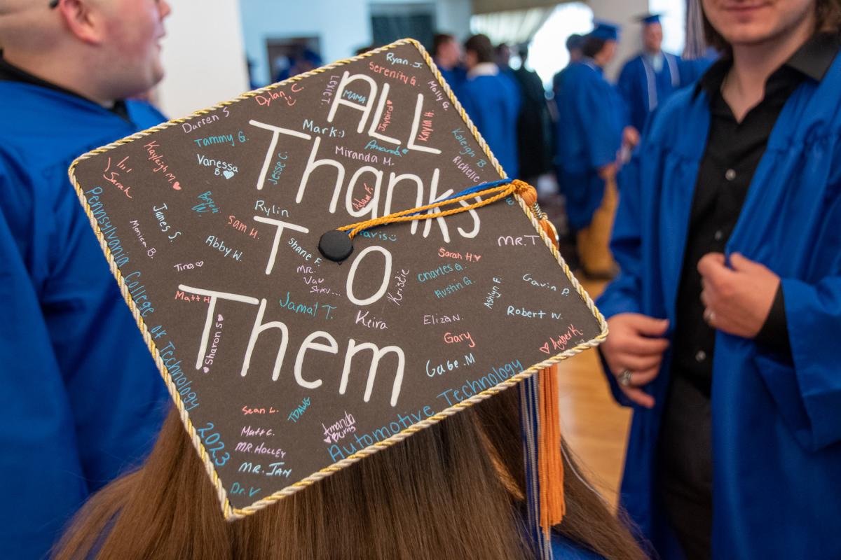 Kasey J. Tarantino’s signed cap acknowledges friends, classmates and faculty. Tarantino, a member of Phi Theta Kappa, earned a degree in automotive technology.