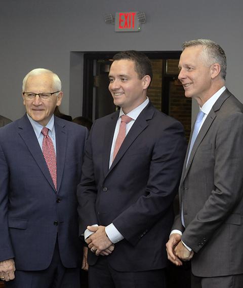 Kevin Sunday (center), director of government affairs, Pennsylvania Chamber of Business and Industry, joins Sen. Gene Yaw (left) and President Michael J. Reed prior to Thursday's hearing. Sunday's wife, the former Heather R. Layendecker, holds Penn College degrees in dental hygiene (2010) and dental hygiene: health policy & administration concentration (2013).