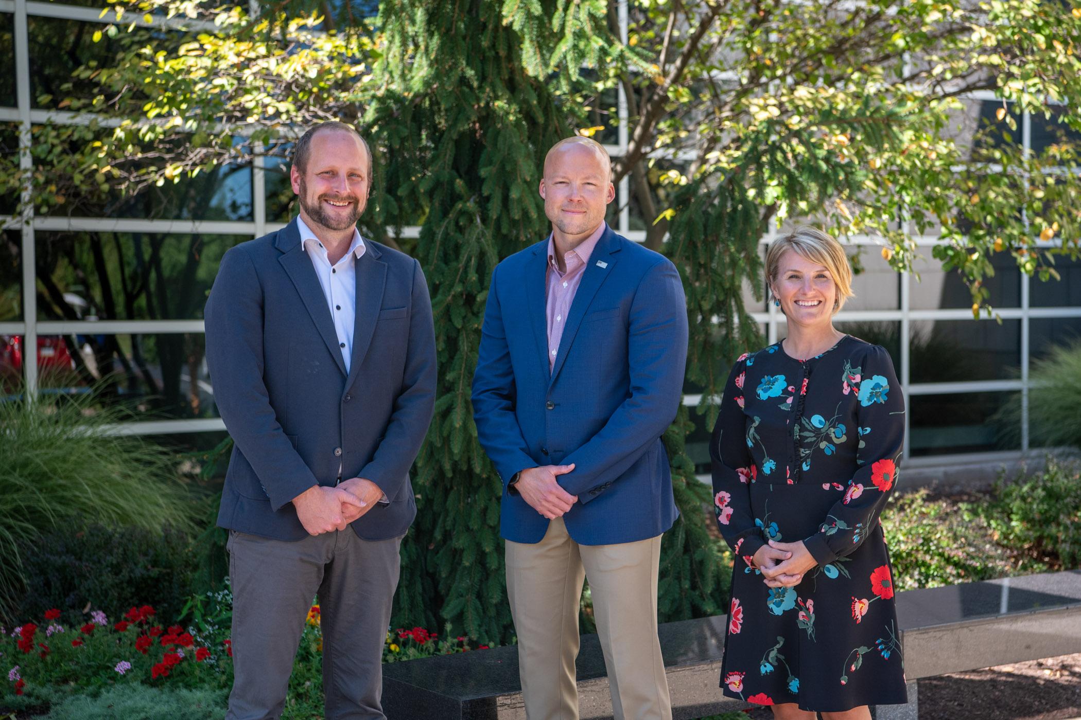 Kyle A. Smith, senior executive director of college relations at Pennsylvania College of Technology (left), and Loni N. Kline, senior vice president for college relations, greet alumnus Jonah G. Howe, of Chesapeake Energy, on campus recently to commemorate the company’s gift establishing an endowed scholarship at the college.
