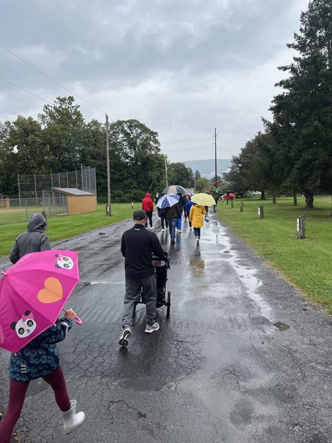 Two teams – PCT Hope, organized by Mary R. Shuma Rudberg, director of counseling, and Katie L. Mackey, assistant director of disability and access resources; and the Wildcat men's basketball team – paid no heed to rain and joined other local residents in Montoursville's Indian Park.
