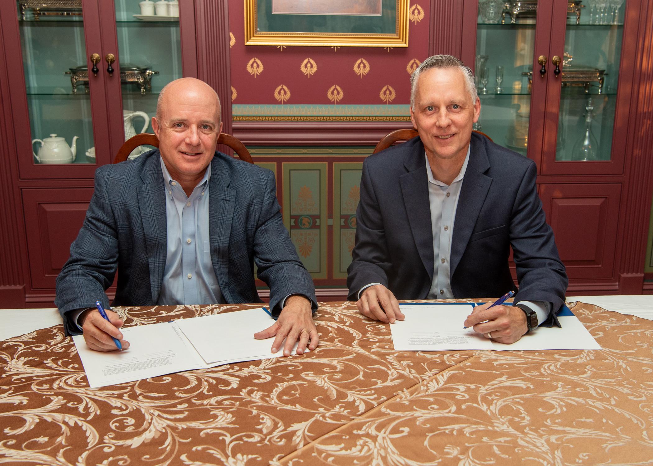 Dave Lambert (left), group president, ITW welding, and Michael J. Reed, president of Pennsylvania College of Technology, sign an extension of an entrustment agreement between the college and Miller Electric Mfg. LLC. The ongoing partnership ensures that students in the college’s welding and fabrication majors can continue to hone their skills on state-of-the-art equipment used throughout the welding industry.