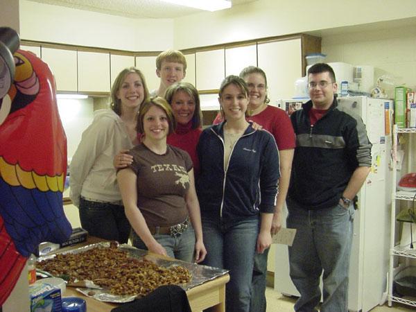 Dental Hhygiene students get last-minute encouragementMarie G. Smith, assistant professor of dental hygiene (center in photo at left), joined a group of students at their on-campus residence for an evening of making baked nuts using her favorite recipe. The activity was considered a study break for the students as they prepare for today's practical portion of their Dental Hygiene board exam. The activity gave students a chance to interact informally with Smith − and get some last words of encouragement before the exam. ( Photo provided by Office of Residence Life)