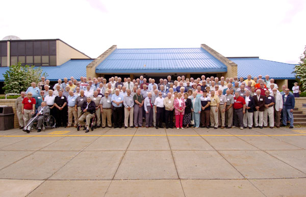 More than 125 Williamsport Technical Institute alumni and guests attended Friday's fifth annual reunion of the Penn College predecessor institution. In far left photo, Joe Hawaka (class of '56) looks over memorabilia in the Susquehanna Room; the center photo shows members of W.T.I.'s first graduating classes, all students in the 1940s: From left are Robert Fries, Willard Snyder, William Sober Sr., Melvin Durrwachter and Lehman Myers; and, at far right, attendees gather for a traditional group shot outside the Hager Lifelong Education Center.