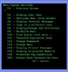 1. Along the bottom of your main AS/400 menu screen, you will see several command key options, including "F5-Services." Press the F5 key on your keyboard to display the System Services menu (shown at right).