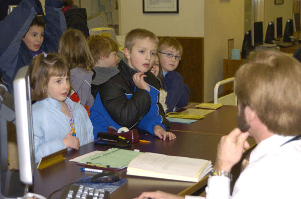 Second-graders ask cataloging librarian Alan W. Buck about the reference desk Students check out the model of the future Madigan Library Around 200 second-graders from the Shamokin Area School District visited Penn College on Thursday following a show at the Community Arts Center. The group toured the college library and ate lunch in the Field House to experience a college campus.