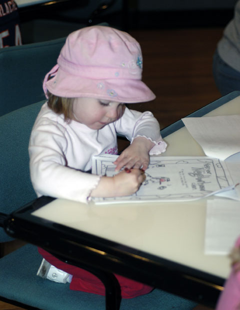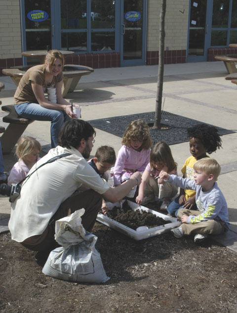 Whatever the crayon, 'green' is the color of the day in Penn's Inn Outside the Campus Center, students Jason R. Grottini and Adrianne R. Watkins show children how to plant white-oak trees Children's Learning Center youngsters listen raptly to a reading of 'The Lorax' Two senior environmental technology management students Jason R. Grottini and Adrianne R. Watkins provided several environmentally based activities for Children's Learning Center youngsters Friday in preparation for "Earth Day." Activities included a reading of Dr. Seuss's "The Lorax," coloring activities related to conservation and recycling, and planting of white-oak trees that the children could take home. The students are members of the college's Earth Smart club, whose activities include highway cleanup and work with area watersheds.