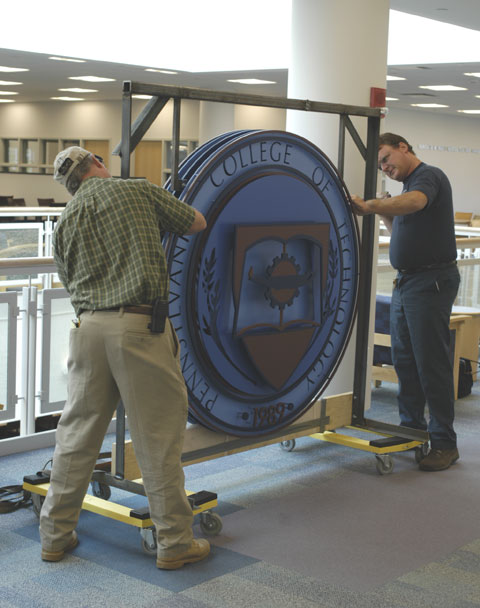 Andrew M. Richardson, construction manager, left, and David P. Socha, HVAC control mechanic in General Services, prepare the 350-pound seal for lifting into place Ken Harris, left, and Shawn Wolfgang, both of Billtown Mechanical Corp., fasten the seal to its supporting cables Natural light lends a complimentary backdrop to the suspended Penn College sealA 350-pound aluminum version of the Penn College seal, fashioned by Ebinger Iron Works in Schuylkill Haven, hangs from the second floor of the Roger and Peggy Madigan Library. The impressive creation was provided by college President Davie Jane Gilmour in honor of her husband, Fred, retired director of instructional technology/distance learning, a 1966 alumnusand designer of the Penn College and Williamsport Area Community College seals.