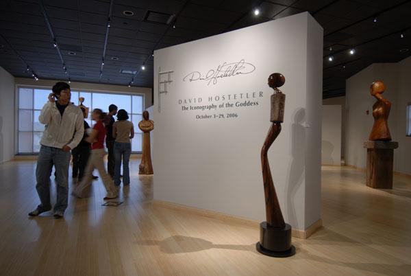 David Hostetler exhibit opens in college gallery Attendees at gallery opening move among the artwork David Hostetler's exhibit, " The Iconography of the Goddess," opened Tuesday afternoon in the Gallery at Penn College (LIB, Room 303) and will run through Oct. 29. Gallery hours are Sunday, 1-4 p.m.; Tuesday and Thursday, 2-8 p.m.; and Wednesday and Friday, 11 a.m.-5 p.m.Hostetler, a professor emeritus at Ohio University, was unable to attend. Photos by Phillip C. Warner, student writer-photographer