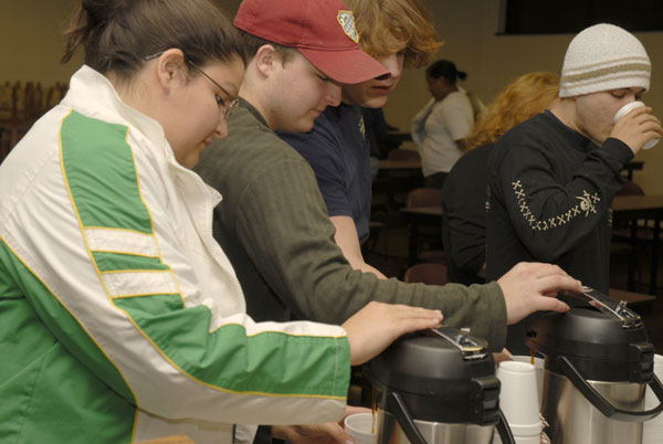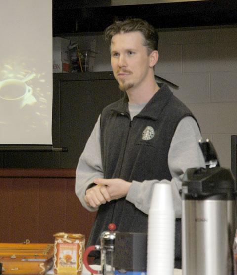 Shawn Sidey, a 1996 Penn College graduate who earned degrees in culinary arts and food and hospitality management, returned to campus Nov. 17 to talk with students about coffee roasting. Sidey, trained as a chef, decided after several years of restaurant and catering management positions, to pursue his joy for coffee as a career. After managing three stores in a cafe chain called Brew HaHa! and becoming roaster for Morning Star Coffee, he took a position as a roaster at Starbucks Coffee Co.'s largest roasting plant. He is now a roasting supervisor at the plant, located in York. He talked with students about how beans are processed from field to packaging, about Starbucks' operations and about the business of selling coffee. Students sampled coffee and tea blends.