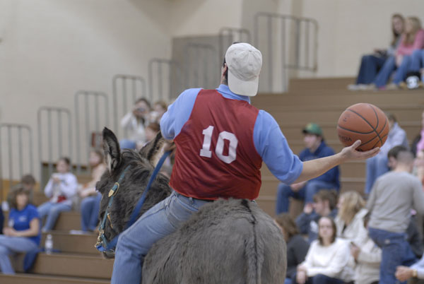 Penn College students and employees celebrated homecoming and supported a new scholarship fund at a donkey basketball game Thursday. All money raised from ticket sales went directly into the new Student Legacy Fund, which will serve as a scholarship program for student leaders at Penn College. This is the first student-established and student-run endowment program on campus. If you were unable to make it to the game but would like to support the Student Legacy Fund, send your gift, along with a note designating it for the the Student Legacy Fund, to the Annual Fund Office at DIF 65. The event was sponsored by the Student Government Association and Student Activities Office.