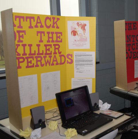 'Attack of the Killer Paperwads' just one of the more whimsical creations among more serious fare BLaST's Ralph Zeigler judges one of the computer-fair entries A regional computer fair for middle- and high-school students from 19 area districts, sponsored by BLaST Intermediate Unit 17, was held Monday and Tuesday at Penn College. Students competed in categories including Web-page design, desktop publishing, logo design, digital moviemaking and graphic design. Visiting students also took part in a Quiz Bowl, workshops on robotics and routers, and campus tours. Penn College faculty/staff joined BLaST personnel in judging the variety of impressive entries. Middle School winners go on to the state level in Harrisburg on April 25; high school winners will face state competition in Carlisle on May 22. ( Photos by Amanda M. Williamson, casual part-time student photographer)