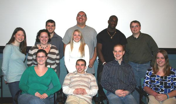 e-mail. Back row, from left: Andrew Schwalm, Senior RA, TheVillage; James Jones, Senior RA, College West; Elonzo "Tigger" Stroud,Student Government Associationrepresentative; and J.C. Phillippy, Rose Street representative. Middle row, from left: Beach; Christie Henning, Senior RA, Campus View; and Welsh. Front row, from left: Daniels; Jeff Pacheco, national communications coordinator; Bateman; and Koch.