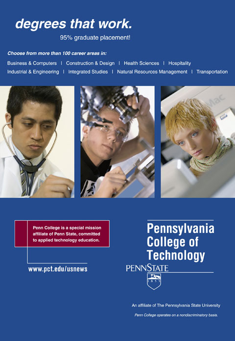 In the contest, sponsored by Admissions Marketing Report, Penn College received a Silver Award in the Magazine Advertising/Single Ad category in Group 3 (colleges with 5,000-9,999 students) for an ad used in U.S. News & World Report's America's Best Colleges publication.