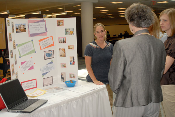 An occupational therapy assistant student dicusses occupational therapy in home design. Visitors could play sports on a Nintendo Wii - a modern method of rehabilitation. As part of Occupational Therapy Month, students from Penn College's occupational therapy assistant program presented poster sessions on emerging or contemporary areas of occupational therapy practice Wednesday in the college's Madigan Library.