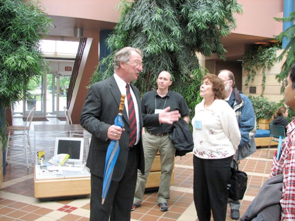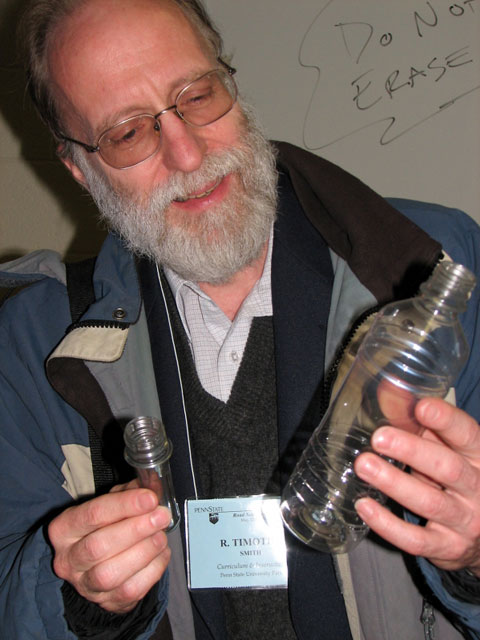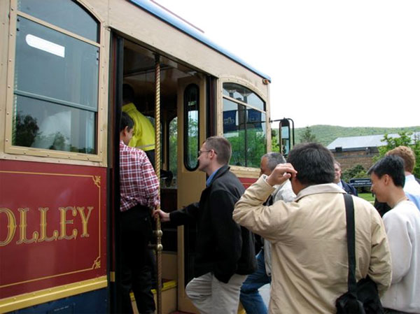 R. Timothy Smith, assistant professor of curriculum and instruction at University Park, examines a bottle made by Penn College's plastics and polymer technology students Penn College's Senior Vice President William J. Martin talks with Road Scholars in ATHS lobby Jacob Langelaan, assistant professor of aerospace engineering (in glasses and gray jacket) is among those boarding trolley for campus tourRoughly 55 participants hit the highway for the 13th annual Road Scholars Tour on Monday. The tour, held May 12-13, offers new and newly tenured Penn State faculty opportunities to learn about the university and Pennsylvania as they travel to several Penn State campuses, businesses and popular historic sites. This year's tour visits four university locations including Penn College as well as the Capitol Building in Harrisburg, an Amish farm in Lancaster County, Eckley Miners' Village in Weatherly, Samuel S. Lewis State Park in Lewisberry, the Milton S. Hershey School in Hershey, the Starbucks coffee-roasting plant in York and Sterman Masser Inc. in Sacramento. For more from the first day of the tour, visit online. ( Photos by Lisa M. Powers, Penn State director of public information)